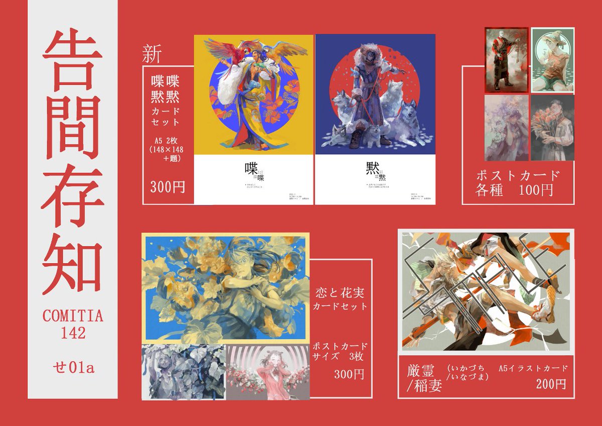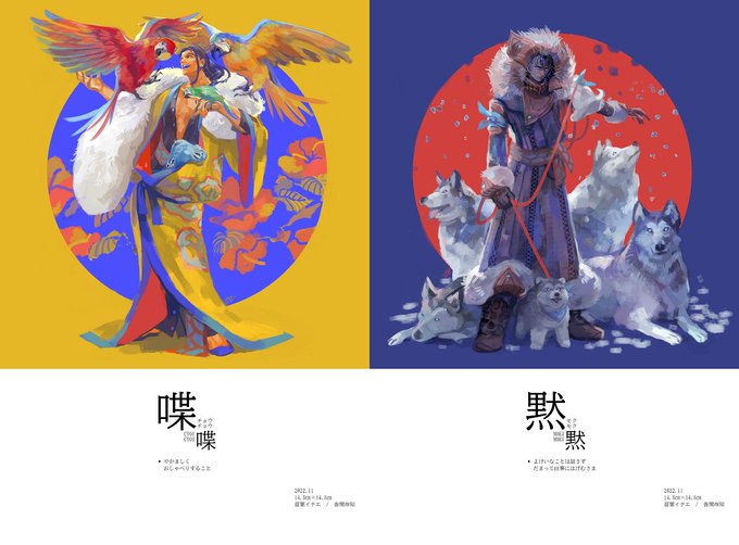 喋喋 / 黙黙(チョウチョウ/モクモク)カードセット(2枚組) | 告間存知 naebainae.booth.pm/items/4339680 #booth_pm #COMITIA142 #創作 通販ページが出来ました。正方形のイラストにキャプションが付いたA5サイズカードセットです。