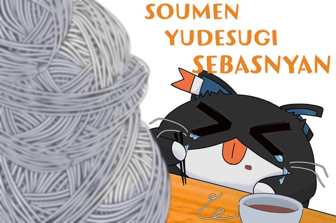 #おにかき カシラが茹で過ぎたそうめんを食べるセバスニャンです。