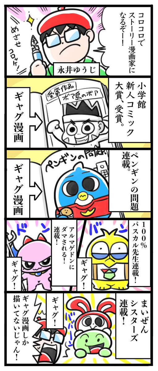 ツッコミ役の山田なおとくんの「なおと」は、漫画家の勝見直人先生のなおとから勝手に取りました。 勝見先生は今、コロコロでフォートナイトの漫画描いてます! #ペンギンの問題 #永井ゆうじ