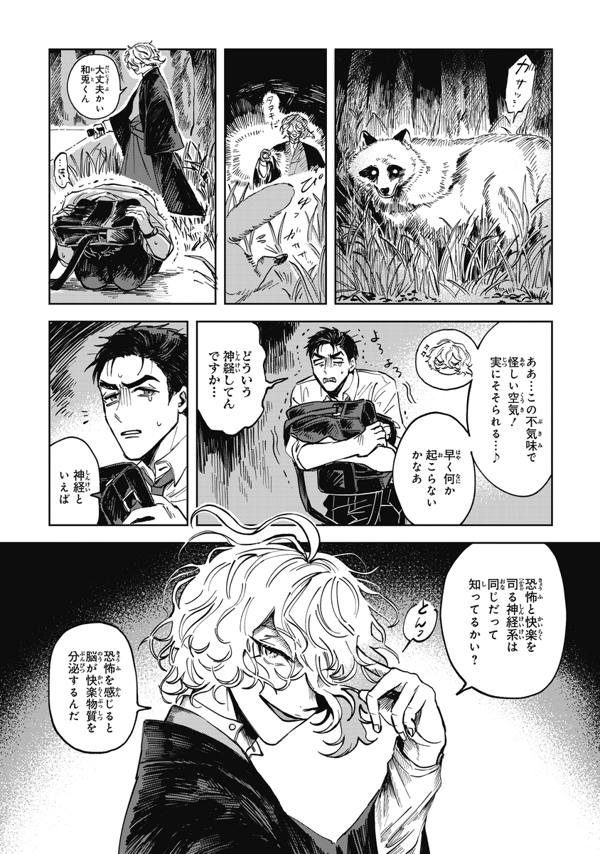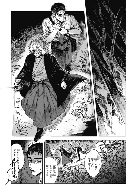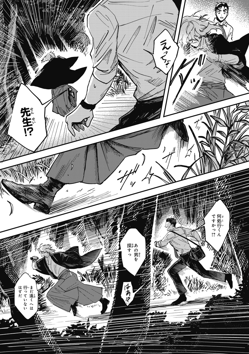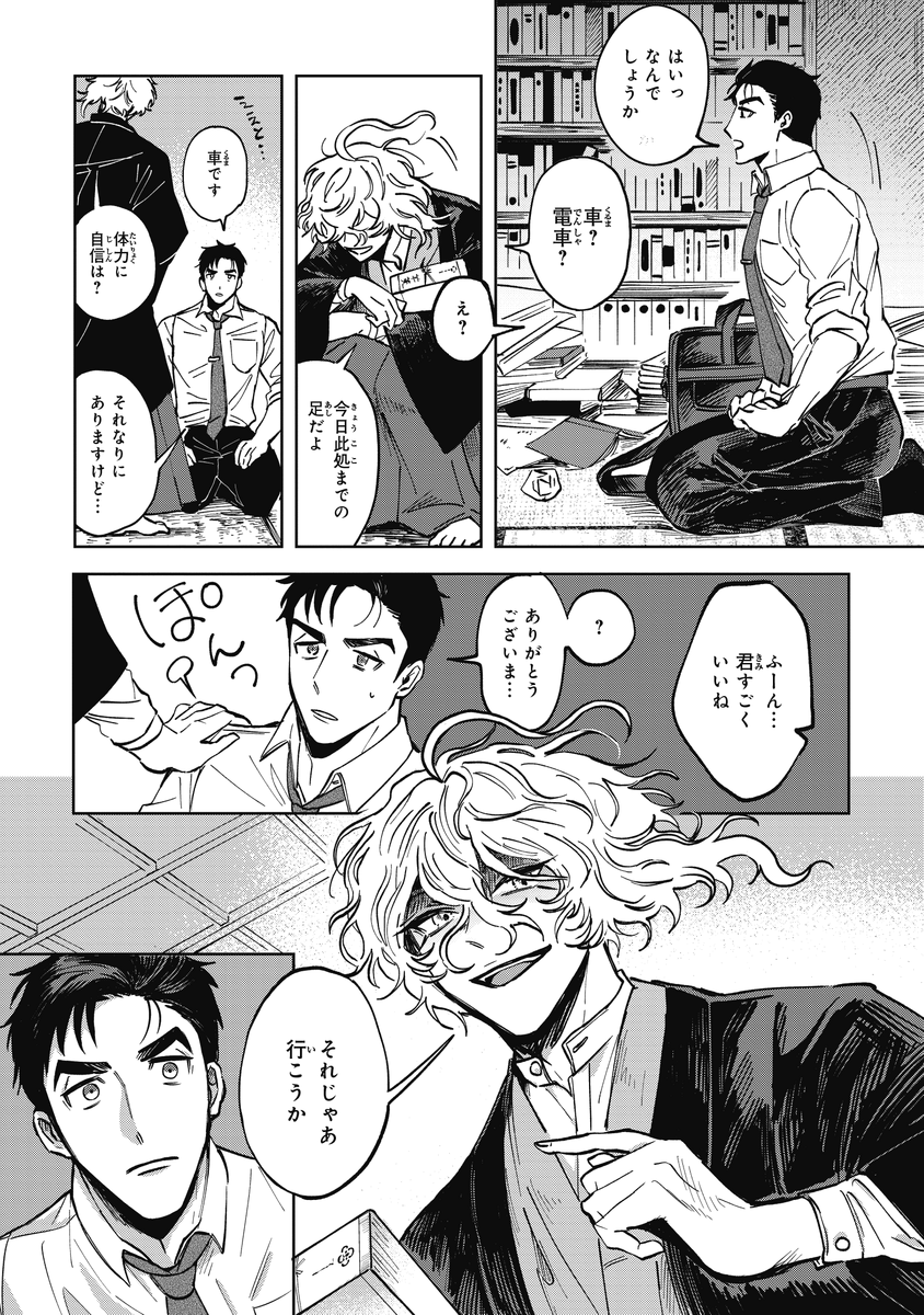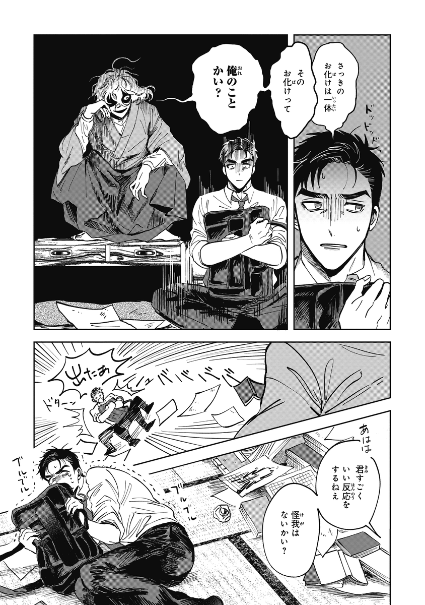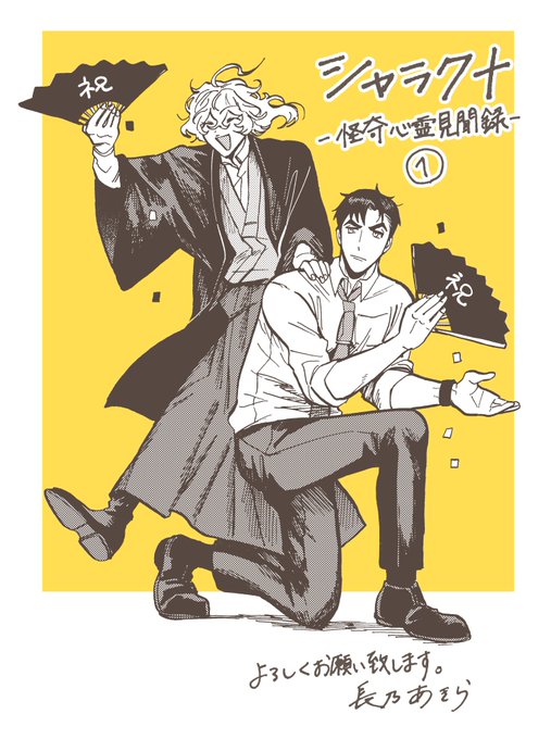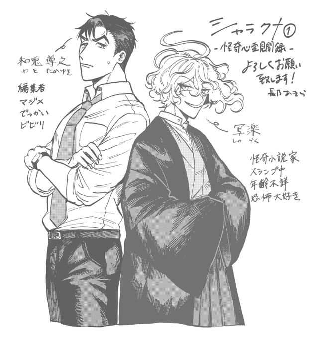 『シャラクナ-怪奇心霊見聞録』こんな感じの男二人が駆け回ってる漫画です。人生初のコミックス化でドキドキですが、楽しんでいただけますと幸いです。