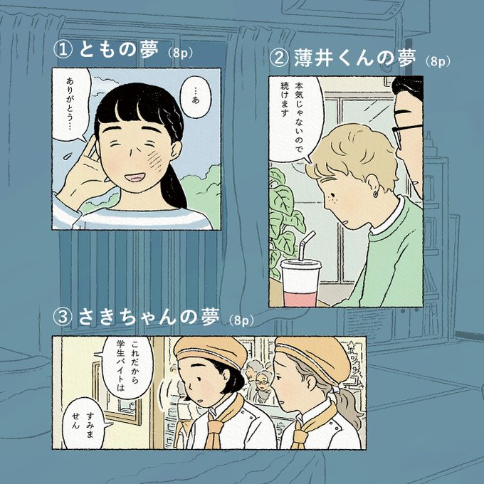 【5/18発売『わたしの夢が覚めるまで』描き下ろし紹介】 主人公以外の登場人物それぞれの夢の話を描きました。地元に帰ったともの夢、恋人との関係に悩む薄井くんの夢、さきちゃんの若き日の夢の3話です。本編よりのびのび描けた気がするので、ぜひお手元で読んでほしいです! store.kadokawa.co.jp/shop/g/g322301…
