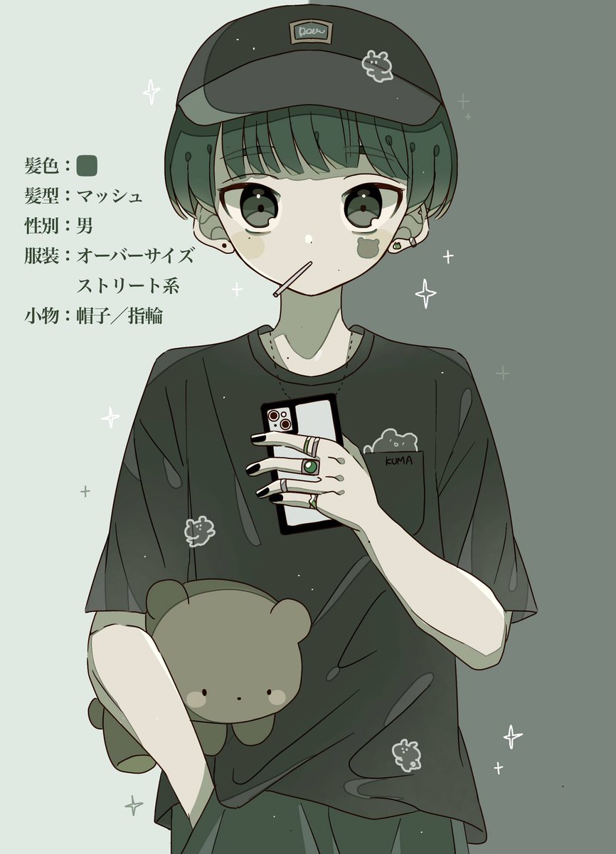 霖雨ちゃん(@rainy_0888 )とお題を出し合ってお絵描きしました!今まで描いたことない色やデザインができて新鮮でした🐻🟩