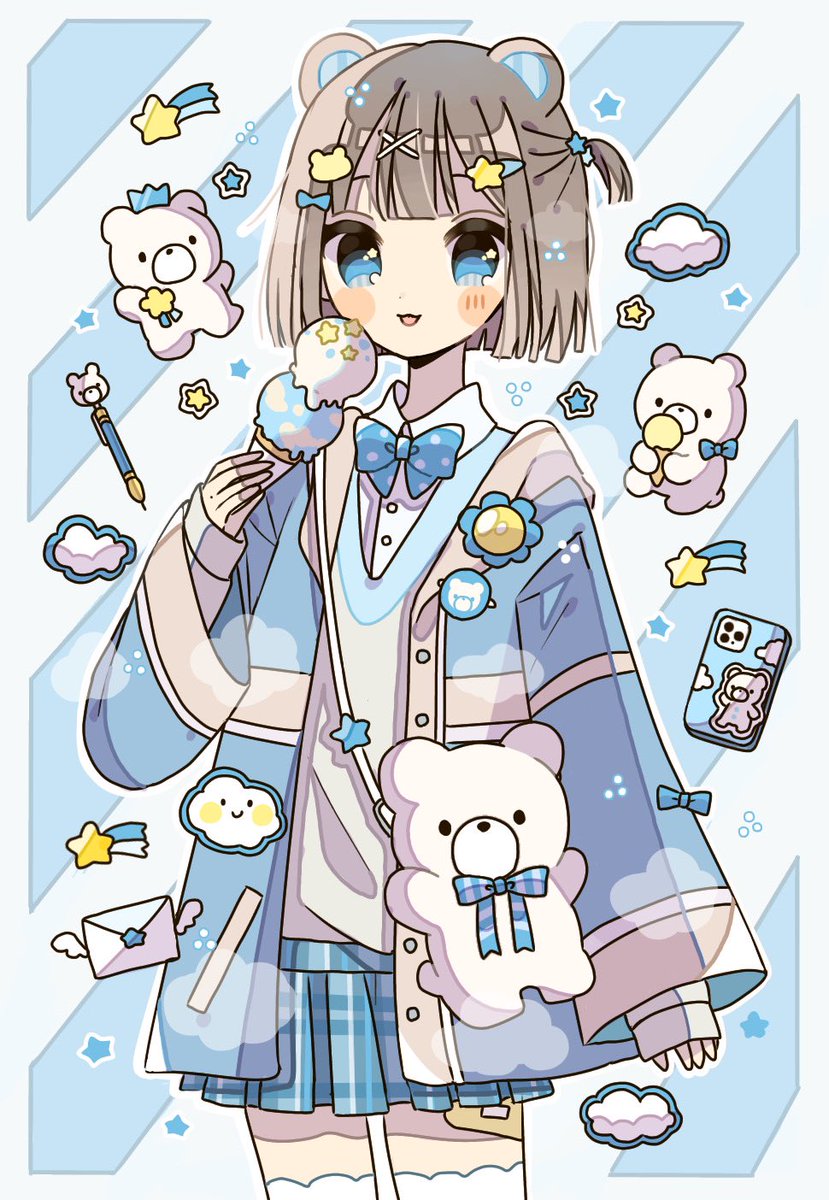 3 20 霖雨ちゃん(@rainy_0888 )とお題を出し合ってお絵描きしました!今まで描いたことない色やデザインができて新鮮でした🐻🟩 22/06/26 20:49