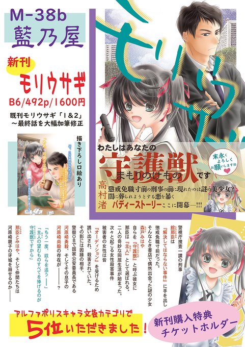 おしながき コミケ1日目(土)東2ホールM-38b藍乃屋で参加します 新刊モリウサギ 試し読みはコチラから alphapolis.co.jp/novel/19395968… #アルファポリス #C100 #コミックマーケット100