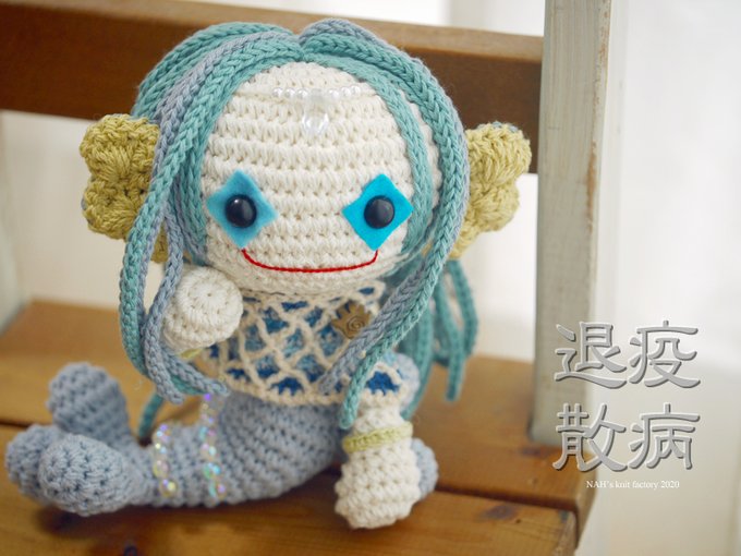 遅くなりましたが、わたしもアマビエ様を作りました。 だいぶアレンジしたので「アマビエちゃん」くらいの感じですが・・・ 全国に生まれた数多のアマビエ様とともに、世界を守ってほしいと思います。 #アマビエ #編みビエ
