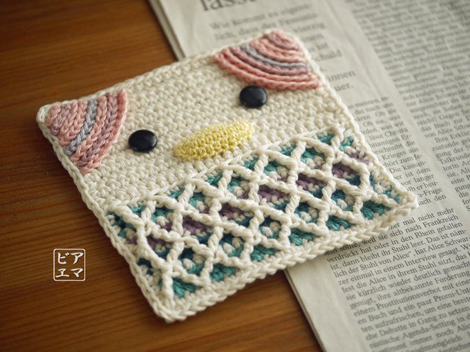 こんなのできました。 スクエア・アマビエちゃんです。 ダイアモンド・ワッフルステッチが編めて、大満足なのです(^ー^)