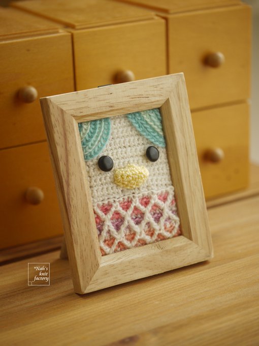 平たいアマビエちゃんをもう一枚編んで、フレーム入りにしてみました。 スタンド仕立てになっていてどこでも立てられるので、机で手元に置いて作業や勉強するのを見守ってもらっています☺️ #アマビエ #編みビエ