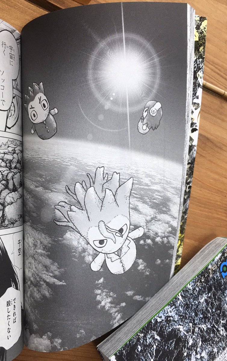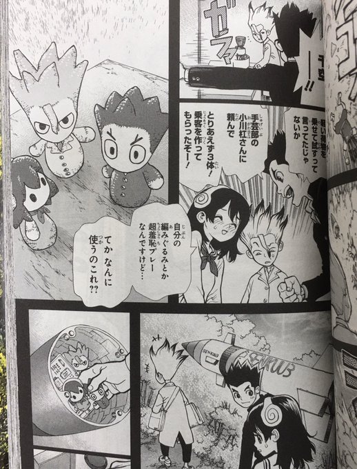 千空が子どもの頃飛ばしたロケットに杠が作ったマスコットが載せられたのですが、これ #あみぐるみ なのですよね。 あみぐるみ作りが趣味の者として嬉しいのですが、なんでフェルトとかじゃなかったのかな?って気になってます。 (千空や大樹の髪の毛は、たしかにフェルトより作りやすそう)