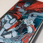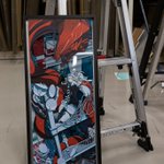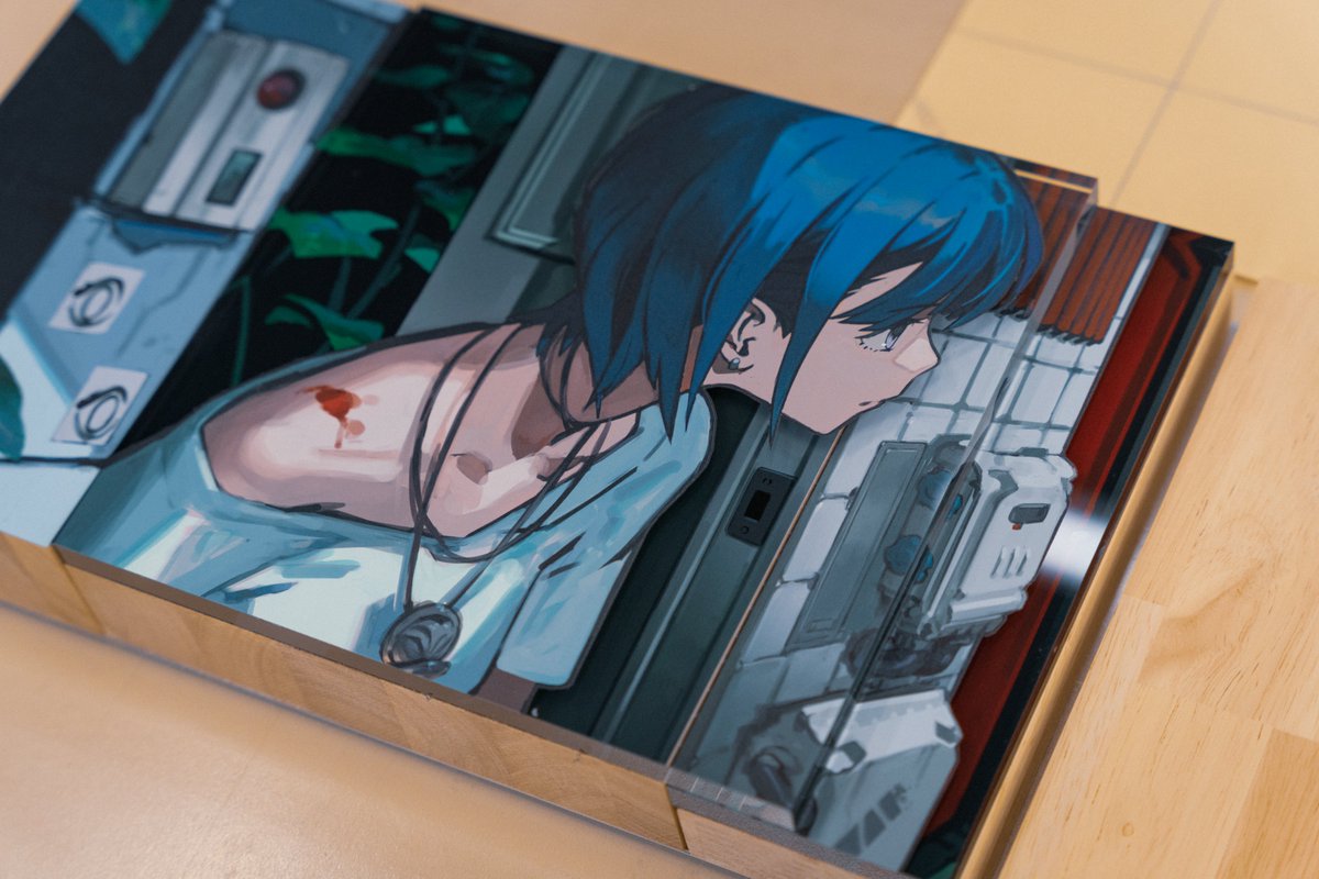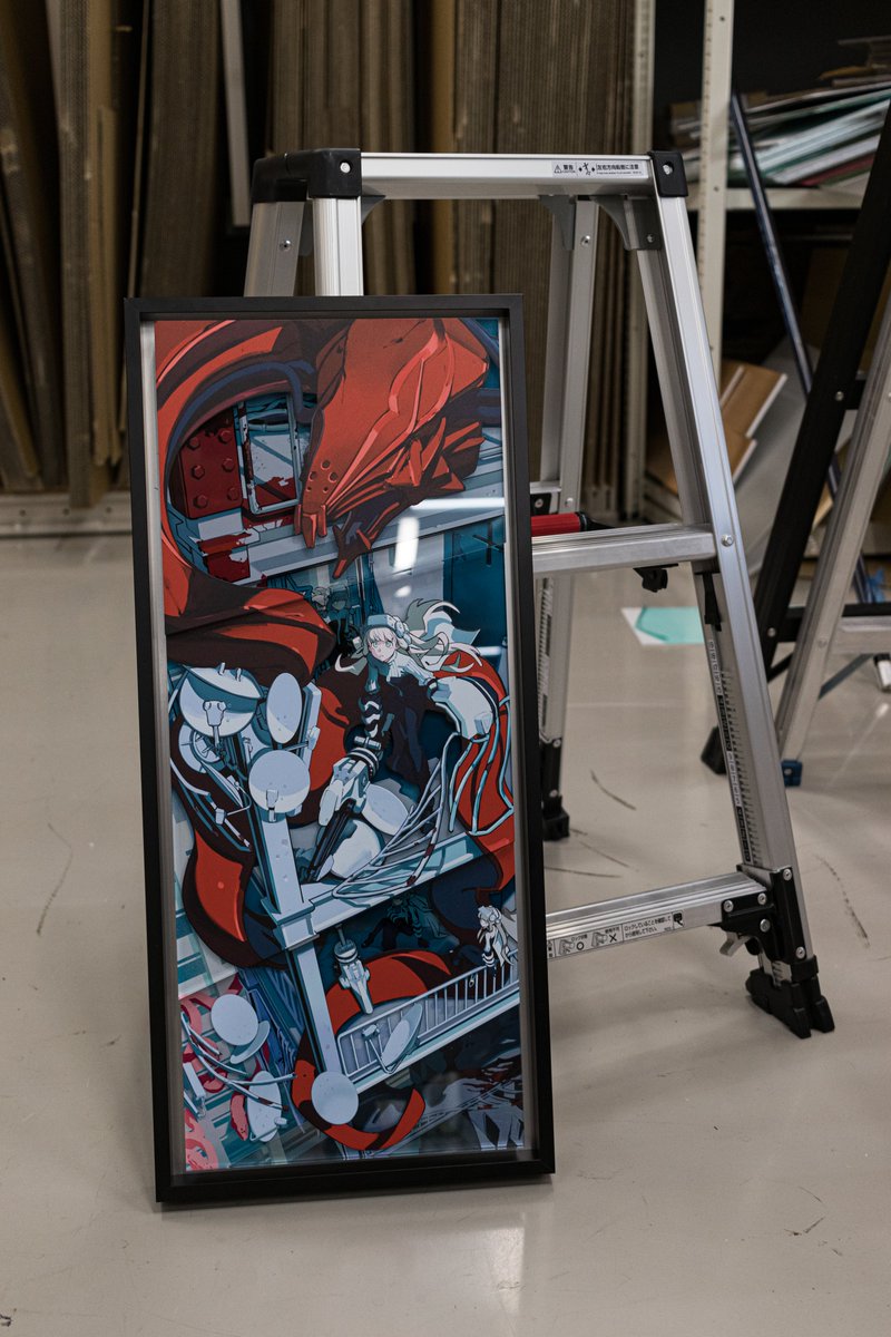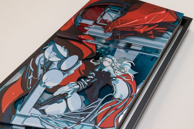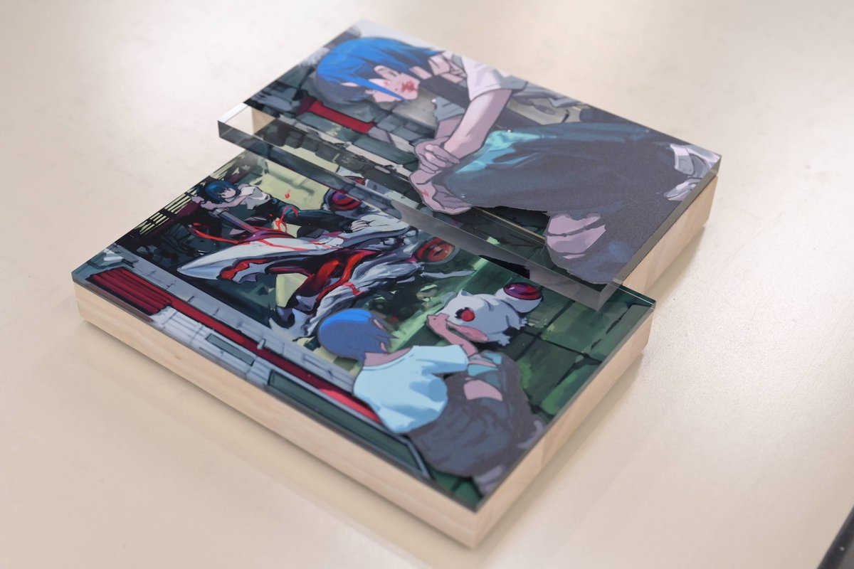 絵のラインに合わせて、素材を斜めカットしています。イラストのディテールが少ない分、立体の印象がわかりやすいです。木材、アクリル、アルミを使用しており、質感の印象が幅広い作品になっています。 #SSSRearise