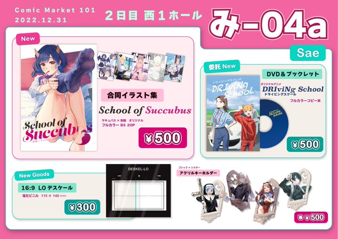 【#C101 お品書き】2日目西1ホール み-04a「Sae」にてお待ちしてます! イラスト集『School of Succubus』 ・サキュバス×制服合同 ・フルカラー20P ・500円 #コミケ101 #コミックマーケット101