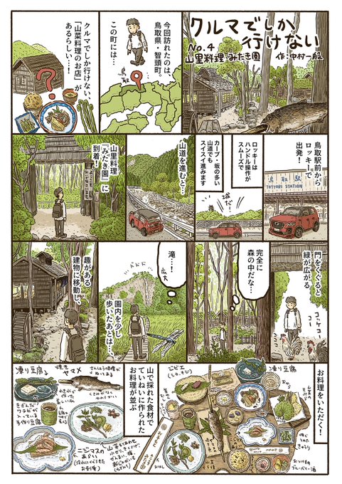 ダイハツさんのフリーマガジン『まどをあけて』にて、ルポ漫画「クルマでしか行けない」を描かせていただいております。今回描かせていただいたのは、鳥取県の山里料理のお店『みたき園』さんです。 daihatsu.co.jp/lyu_action/boo…
