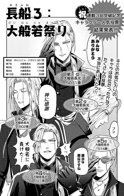刀ミュ新作のチケット討ち死にでメンタルが落ち込んでたときに職場でボーボボの話をすることで救われたので大般若さんの人気投票しました(一部トレス)