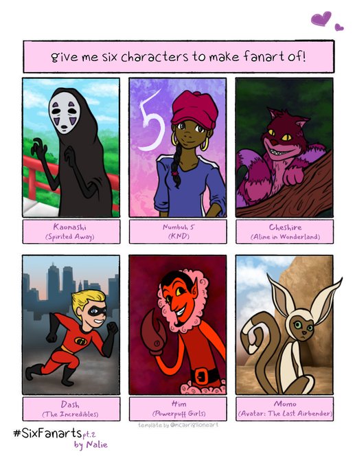 3 12 E hoje é o dia de postar a parte 2 do desafio! Hahah Devo dizer que fiquei muito contente por ter 12 sugestões de fanart pra fazer 😊🌸 #SixFanarts #ArtistOnTwitter #Arte #Fanart #Art #Colorido #Kaonashi #Numbuh5 #Cheshire #Dash #Him #Momo #Draw #Sketch 20/11/11 01:37