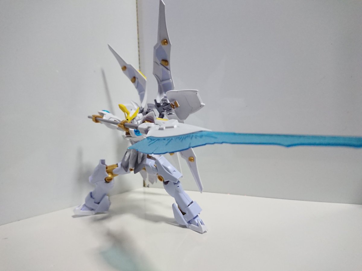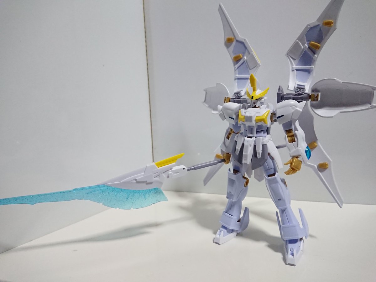 #ガンダムブレイカーバトローグ #ガンプラ ガンダムリヴランスヘブン完成 ヘリオス同様本キットが優秀な為可動も良く新装備の槍も大きくカッコい。ほぼ新規の機体ですがどこかでみたことある用に見えるパーツも面白い。 不満はクロークを閉じたとき綺麗に閉じづらいことです。