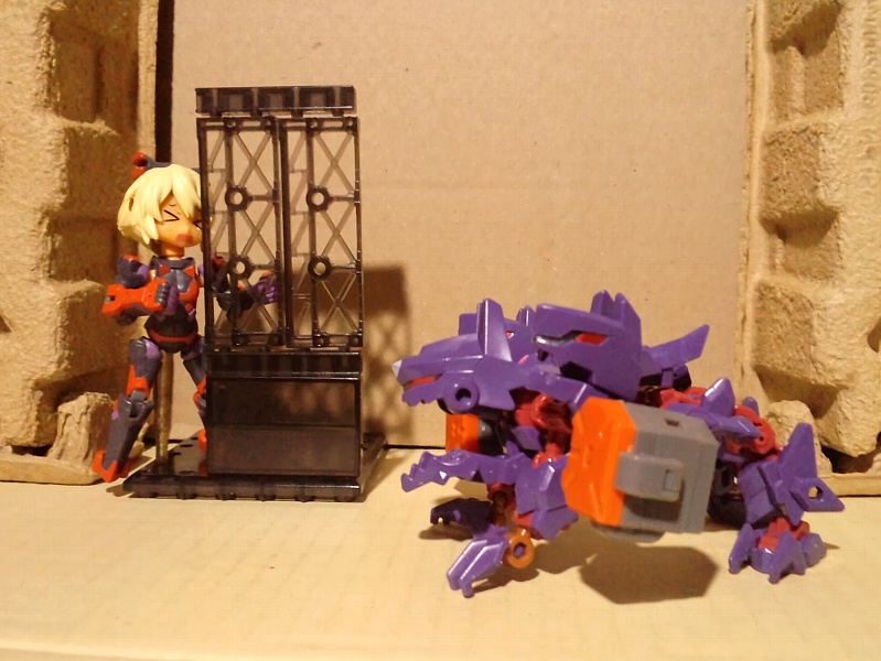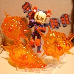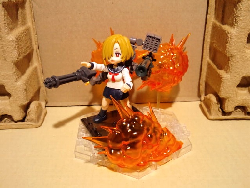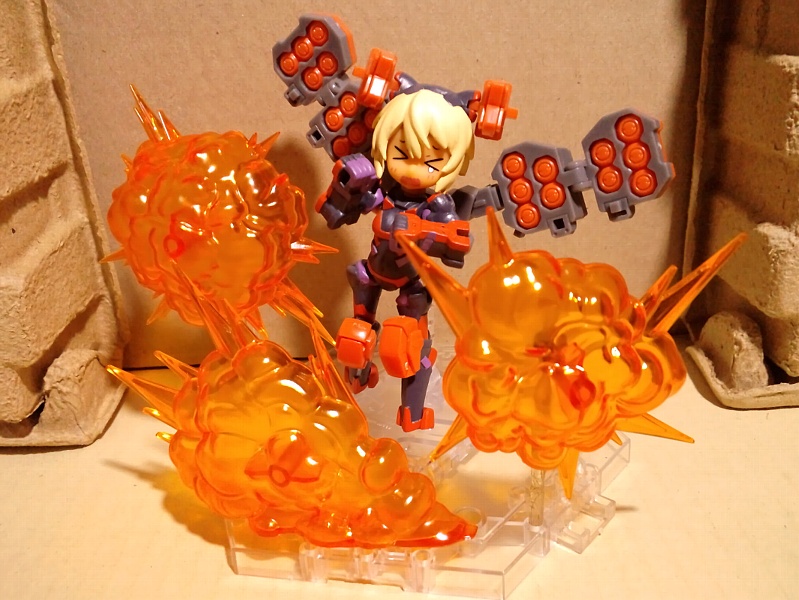 【 #デスクトップアーミー 】 #迫力あるプラモ写真をみせて 「全高8cmのチビだからってナメんなよ!」 「負ッけないよー!!(どかーん!!)」 …本体は小さくても、武装とエフェクトパーツとノリと勢いで、意外とどうにかなるモノよね。(笑)