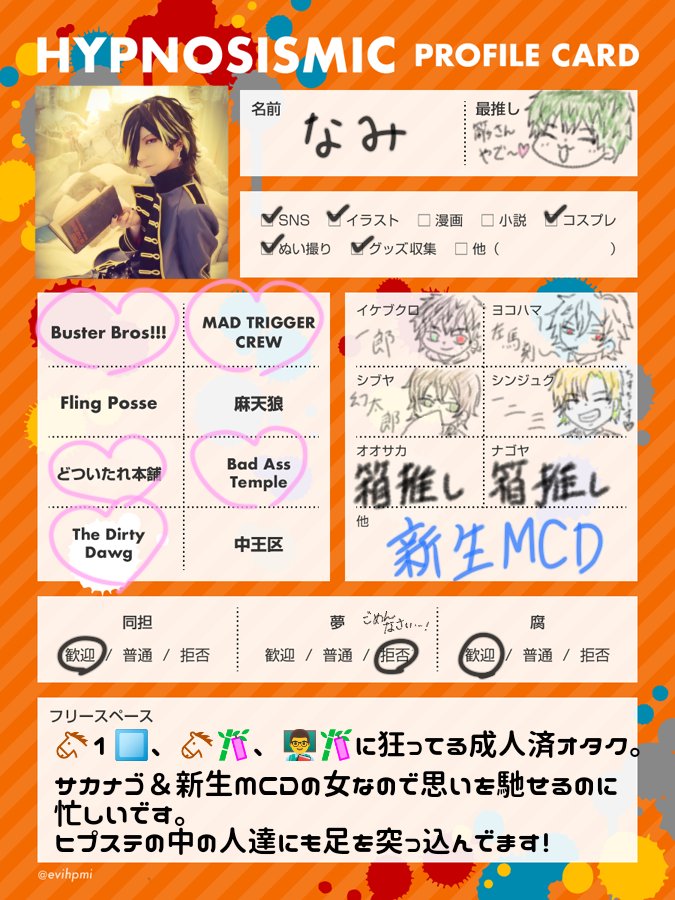 久ッッッしぶりに繋がりたいタグ〜! 東北で好きな事やって遊んでるサカ女&新生MCDに思いを馳せ続けるオタクです💛 ♡、RTで気になった方お迎えに行きます☺️✨ #ヒプマイ好きさんと繋がりたい #ヒプマイレイヤーさんと繋がりたい #ぬいママさんと繋がりたい #ヒプマイ自己紹介カード