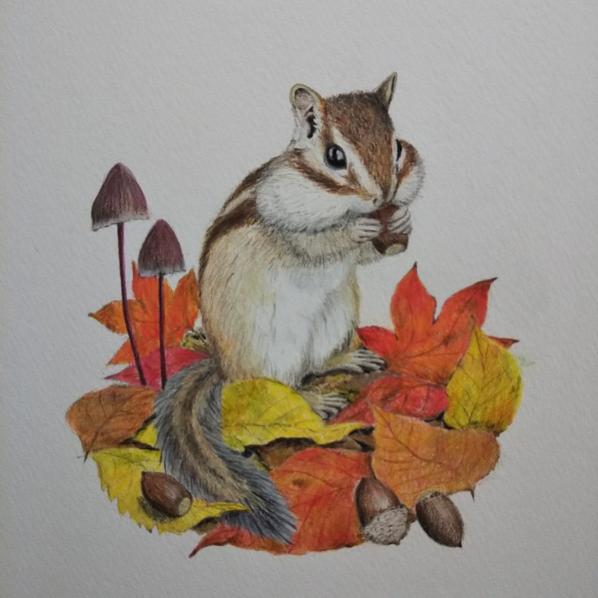 これめっちゃおいしい! 『これめっちゃおいしい!』 『えっホント?』 #シマリスの頬袋 #色鉛筆画 #秋