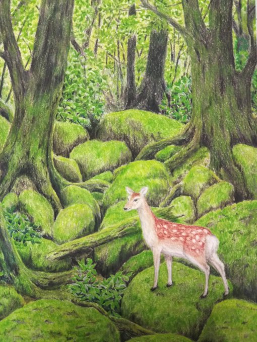 苔むす森 色鉛筆で描いてます ブナの原生林をイメージして描きました。 #色鉛筆画 #原生林 #苔