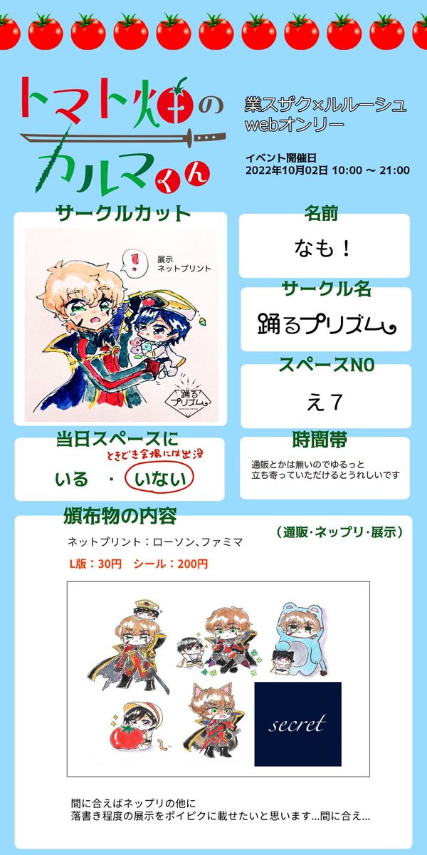 業スくんオンリーの告知です🍅 業スくん+ベビ帝のシールメインで、 ネップリの番号は会場のお品書きに記載する予定です〜 展示もらくがき程度になると思いますがポイピクに投げる予定ですので気軽にお立ち寄りください🙏 #カルマくん_szll