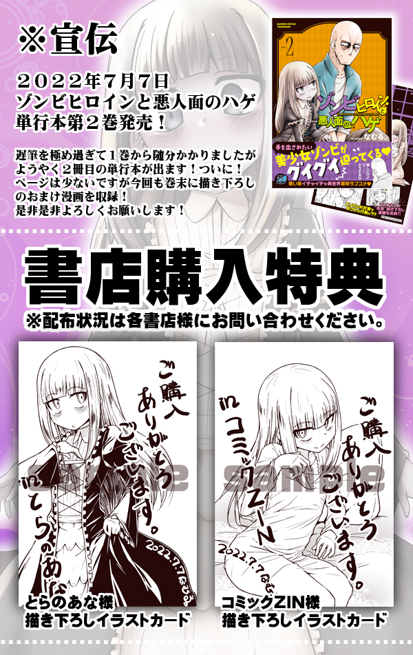 気が付いたらもう7月でギリギリの告知になっちゃいましたが7月7日に2巻が発売になります! 遅筆過ぎて1巻から1年半以上かかりましたがようやく!w 是非よろしくお願いします!(*ノωノ) #ゾンビヒロインと悪人面のハゲ