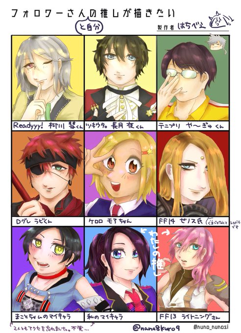 #フォロワーさんの推しが描きたい 描けたーー!!!フォロワさんの推し7人+自分の推し2人! 初描きのコたくさんですごい楽しかった…ありがとうございました😊😊