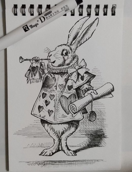 0 4 爱丽丝 ♪―――――― 姦しまやかしお伽の国で 兎の背中を追いかけていた ✒️―――――― あ、これは時計ウサギじゃないや💧 #模写 #ペン画 #爱丽丝 #米津玄師 20/06/22 19:54