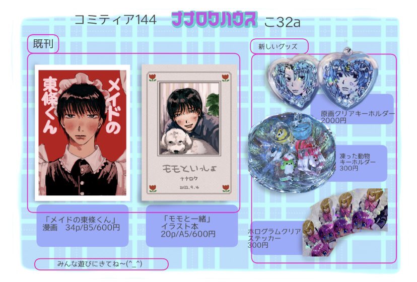 6 16 5/5 #コミティア144 おしながき! 原画アクキーは多分二種類しかない、申し訳ありません こ32a で当日お待ちしてます〜🥹☀️ 23/05/03 20:24