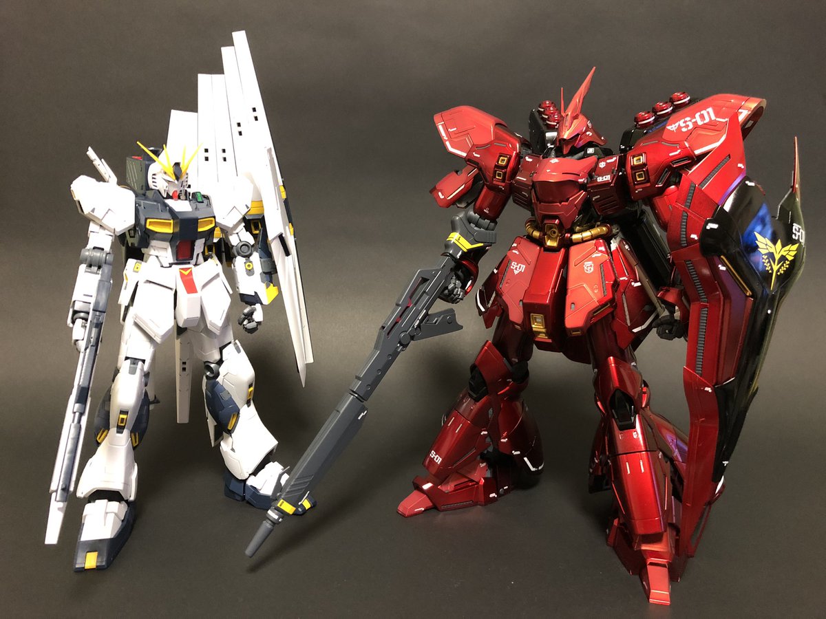 1番好きな劇場版作品『逆襲のシャア』の主役機 νガンダムは素組みなので今後色付け予定 サザビーは、はじめましてのエアブラシ塗装でキャンディ塗装に挑戦した作品 やっぱりνガンダム、サザビーはカッコいい! #ガンダム #ガンプラ #今年作ったプラモ晒そうぜ