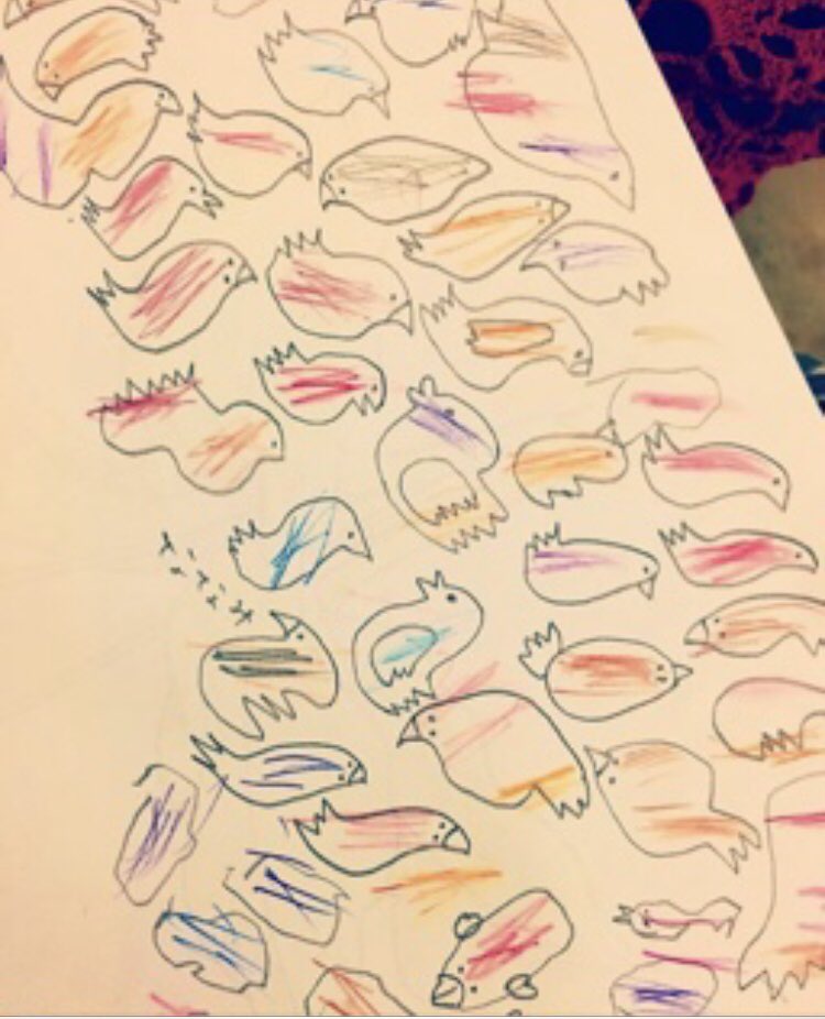 0 3 おばあちゃんが 塗った色鉛筆の色を鉛筆で囲って 鳥の家族達を描きました。 おばあちゃんとコラボ作品。 #おばあちゃん #色鉛筆 22/03/10 22:37