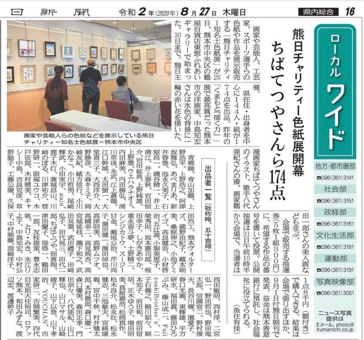 9 29 昨日から始まりました 「熊日チャリティー知名士色紙展」 に色紙1点描きました。 夫と義父もそれぞれ一点出品しております。 収益は全て社会福祉に役立てられます。 是非お出掛けくださいませ。 鶴屋百貨店にて30日までです。 20/08/27 10:57