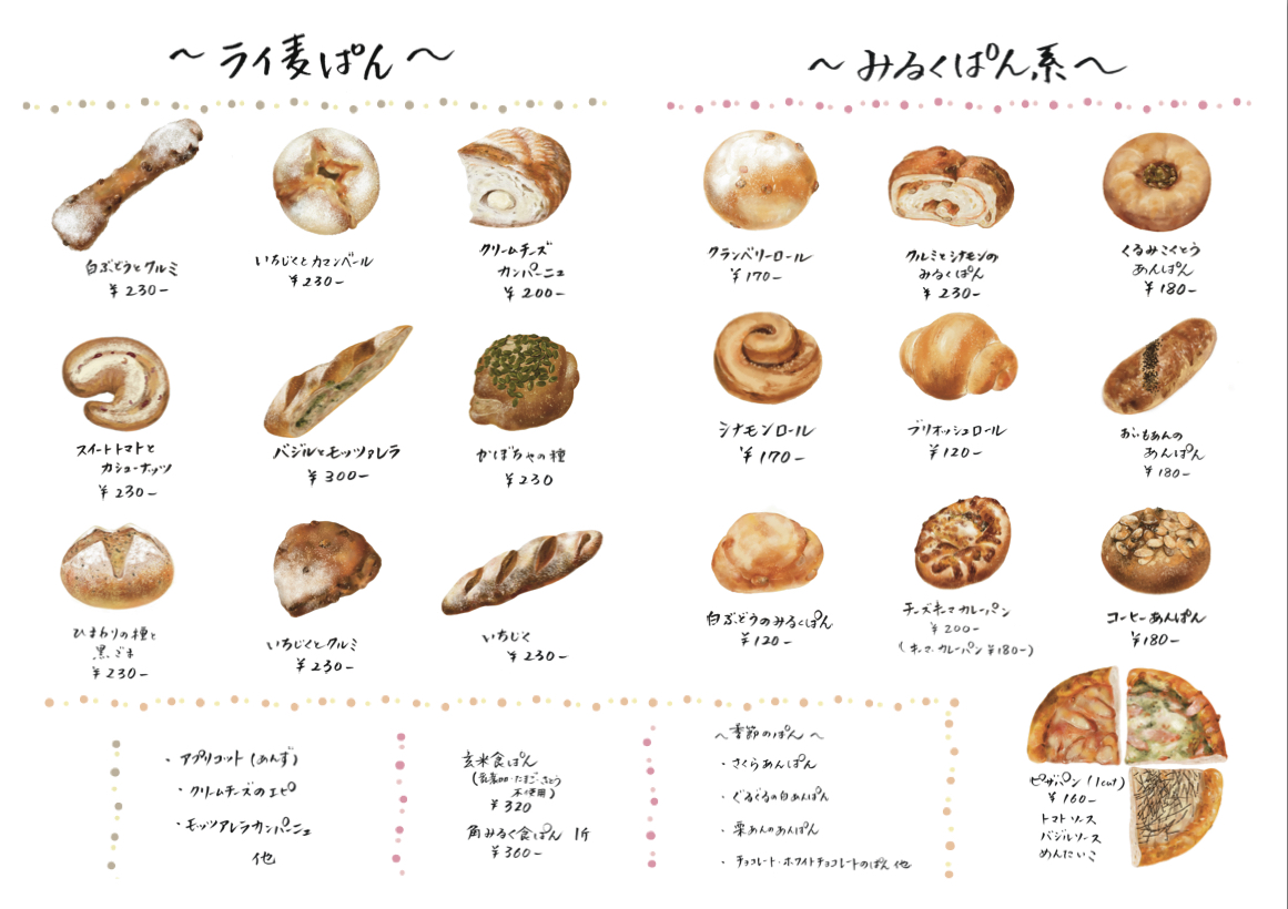 八代の美味しいぱん屋さん、 「やきむぎや」さんの おしながきのイラストを描かせていただきました。 どのぱんも美味しくて、お腹の中から幸せになれます🎵