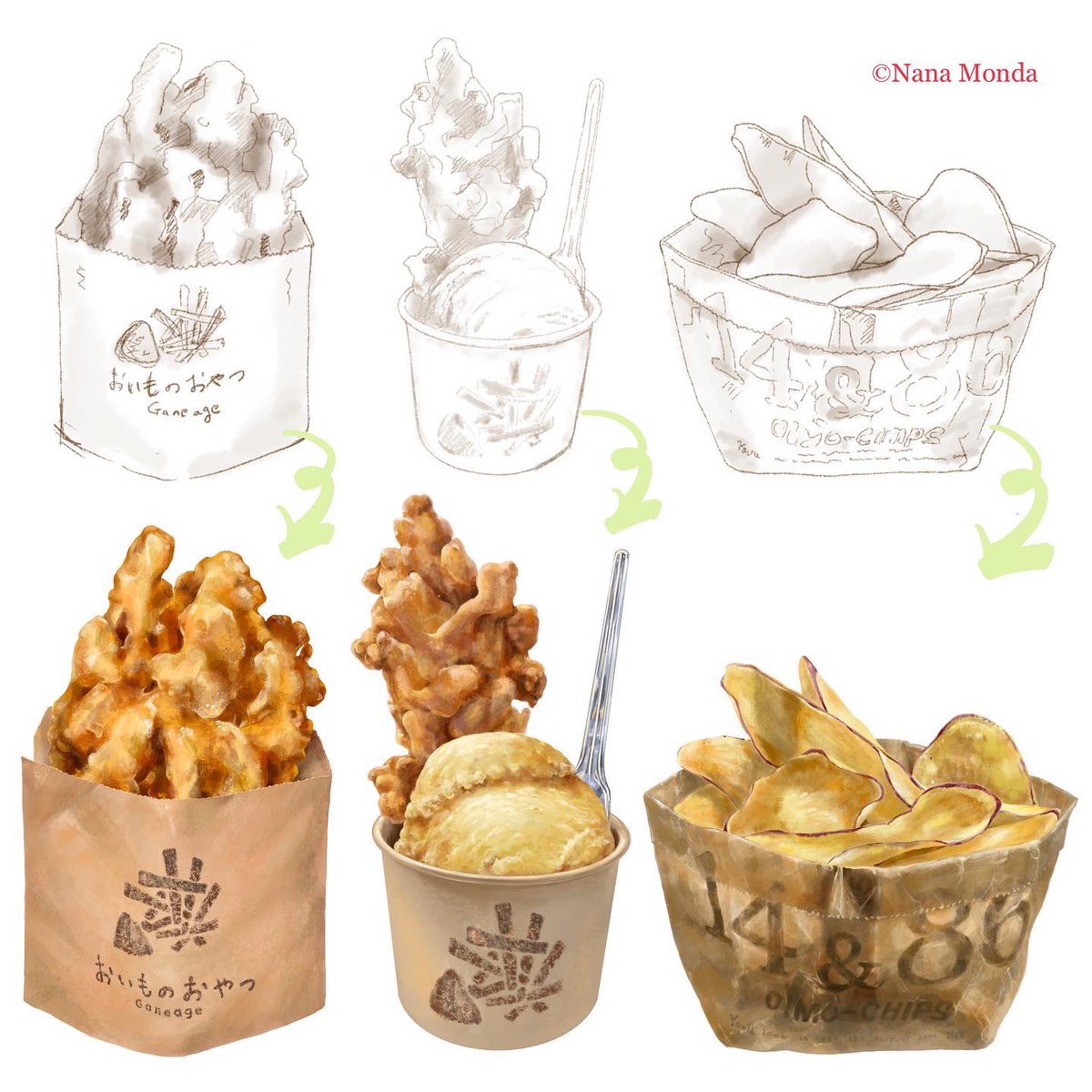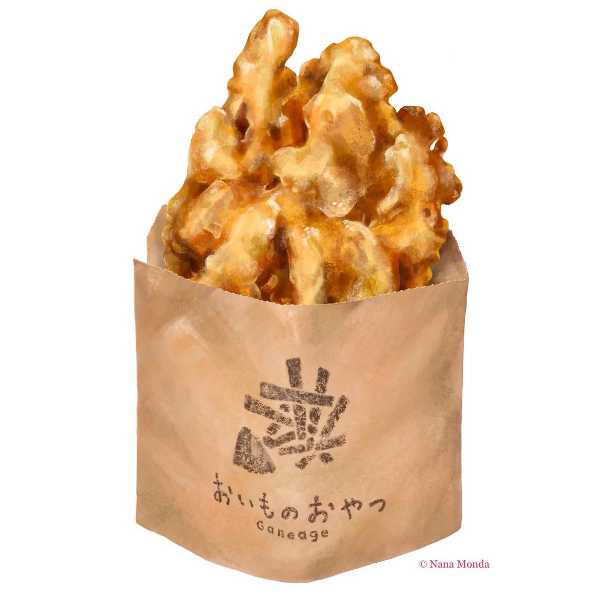 13 51 【お仕事ご紹介】 この度、熊本市にある「おいものおやつ」様よりご依頼をいただき お店の看板商品である「がねあげ」等 お芋を使った美味しい商品たちのイラストを描かせていただきました🍠 1枚目ががねあげ。2枚目はラフからの完成図。 3.4枚目はおいものおやつ様Instagramより引用いたしました。 22/05/02 17:22