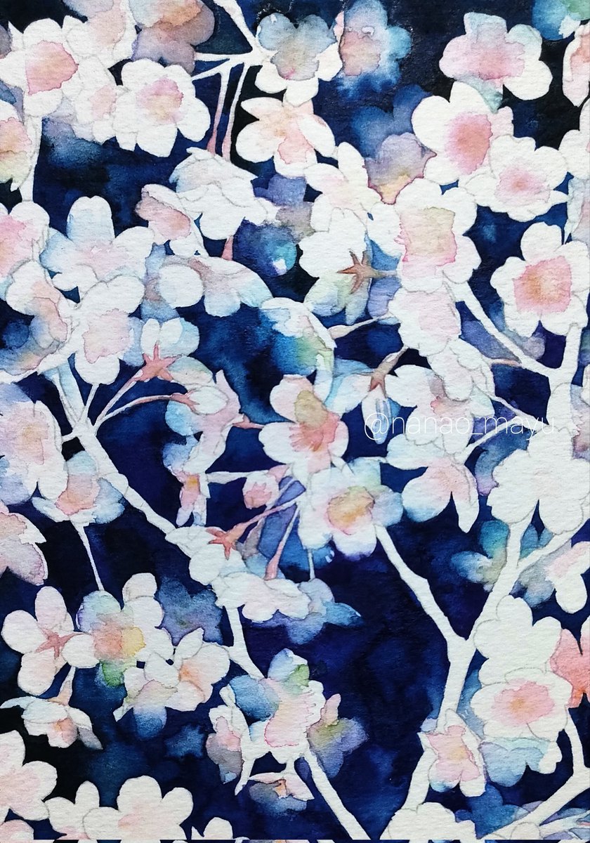 A4(210×297mm)/透明水彩/ホワイトワトソン 「夜と歩く」 途中の写真や動画にも沢山反応ありがとうございました! めちゃめちゃ励みになりました。 普段はアクリルで描いてるけど私の水彩もなかなか良くない? #透明水彩 #nanao_mayu