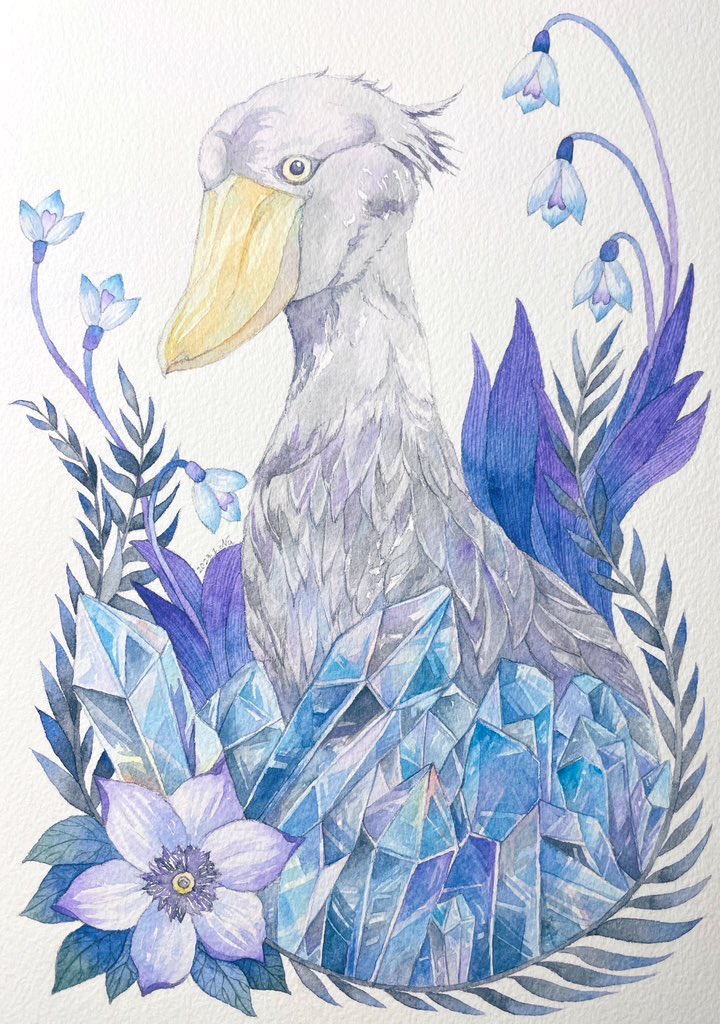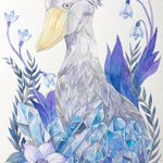 10 52 ハシビロコウと水晶と。 #透明水彩 #ハシビロコウ #宝石 23/01/09 20:42