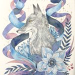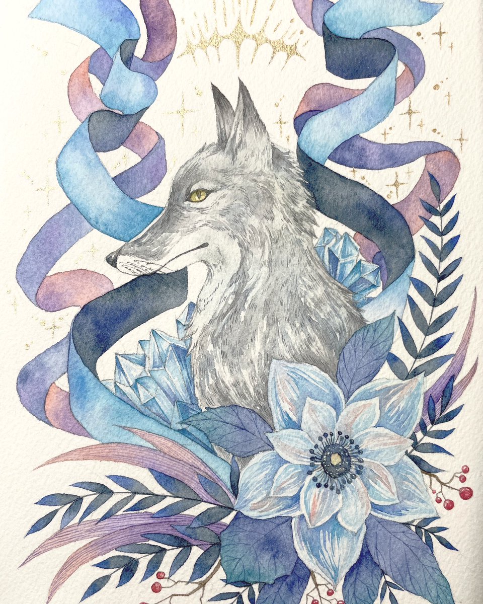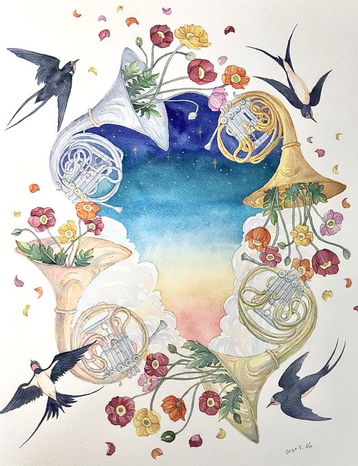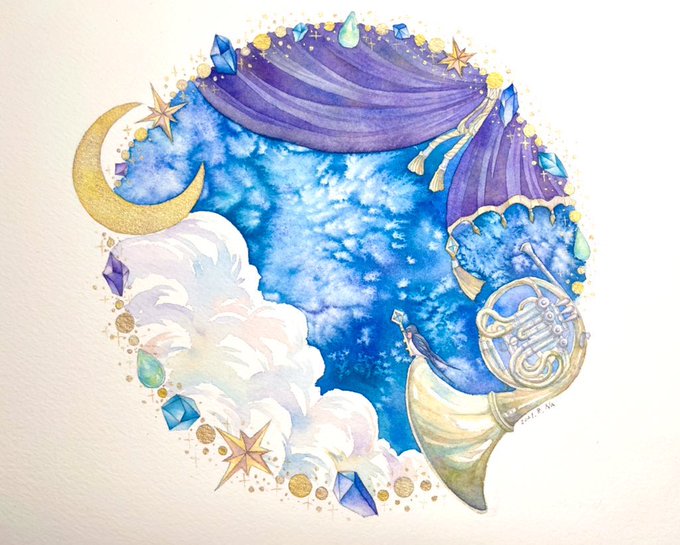 蒼の世界へ #透明水彩 #ホルン #オナガ 使用画材…透明水彩(シュミンケ、ウィンザーニュートン)、ホワイトワトソン紙、アクリルガッシュ(金のみ)