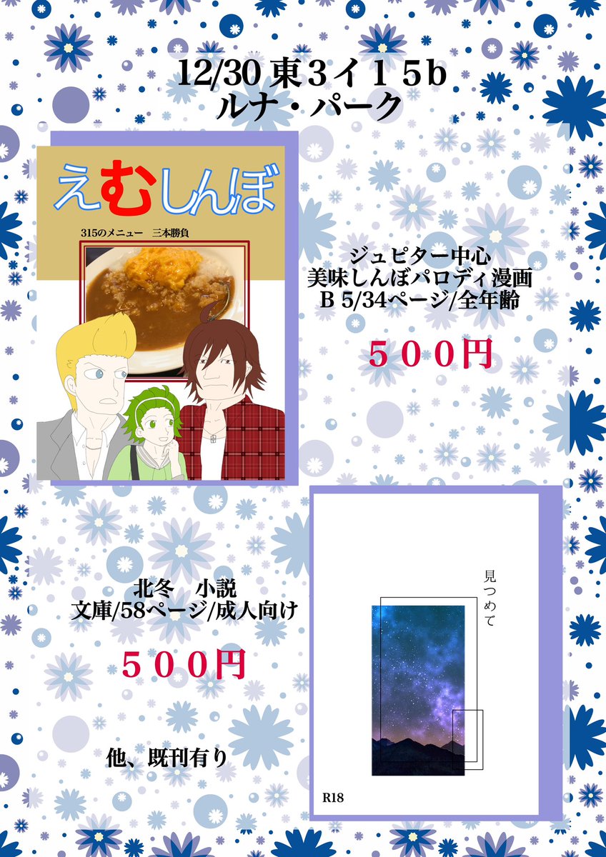 あなたのサークル「ルナ・パーク」は、コミックマーケット101で「金曜日東地区 "イ " 15b」に配置されました!コミケWebカタログにてスペース配置場所公開中です! webcatalog.circle.ms/Circle/Map/168… #C101WebCatalog 冬コミ受かりました!北冬小説と、Jupiterの美味しんぼパロ漫画の新刊を発行予定です!