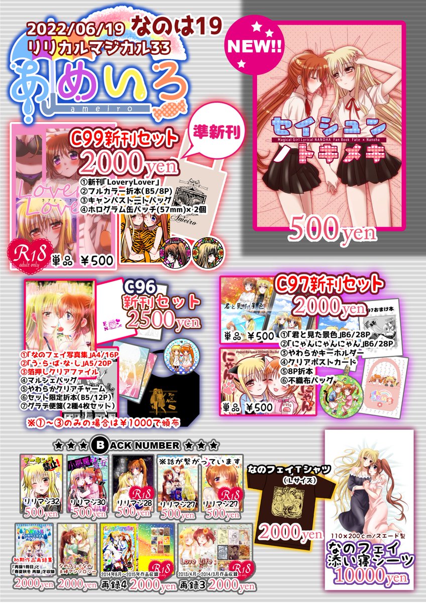 夏コミ(C102)「あめいろ」のお品書きです 08/12【東6 セ07a】 リコリコ新刊→twitter.com/nanashiki_ame/… 08/13【東6 ノ31a】 なのは新刊→twitter.com/nanashiki_ame/… 両日参加です! よろしくお願いします('ω')ノ #C102 #C102お品書き