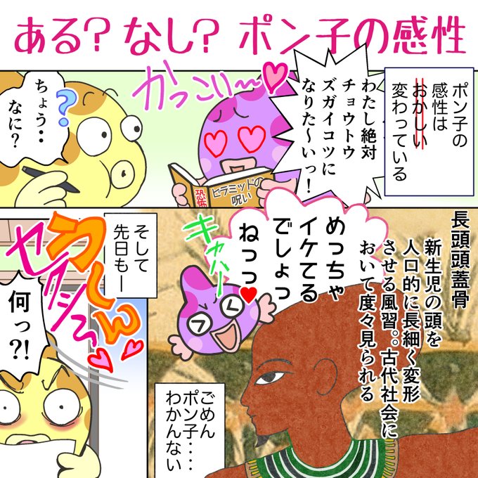 最近学校でエロいだの、セクシーだの 変な言葉を覚えてきて、そして 間違った使い方をしているポン子。 でもポン子なら ツタンカーメンにお仕えできるかもしれない。 ファーブルと徹夜で語り合えるかもしれない #イラスト好きな人と繋がりたい #漫画が読めるハッシュタグ #漫画 #子育て漫画