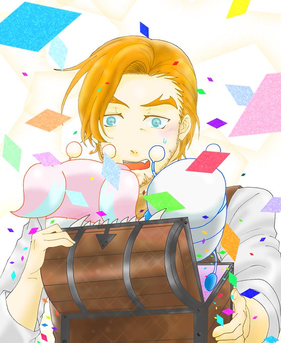 【ラウル】 お誕生日おめでとうお兄さん!………というよりは推しイベおめでとうみたいな絵になりましたが(笑) これ描いたおかげで宝箱(?)の名前がイミティだって知りました。 推しイベ実は2回とも1桁です。頑張った! ※この後お兄さんはかみつきぬいぐるみに噛まれる #ルミナリア版ドロライ企画