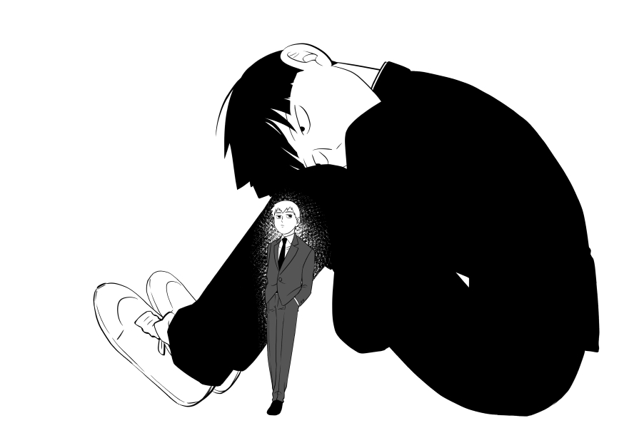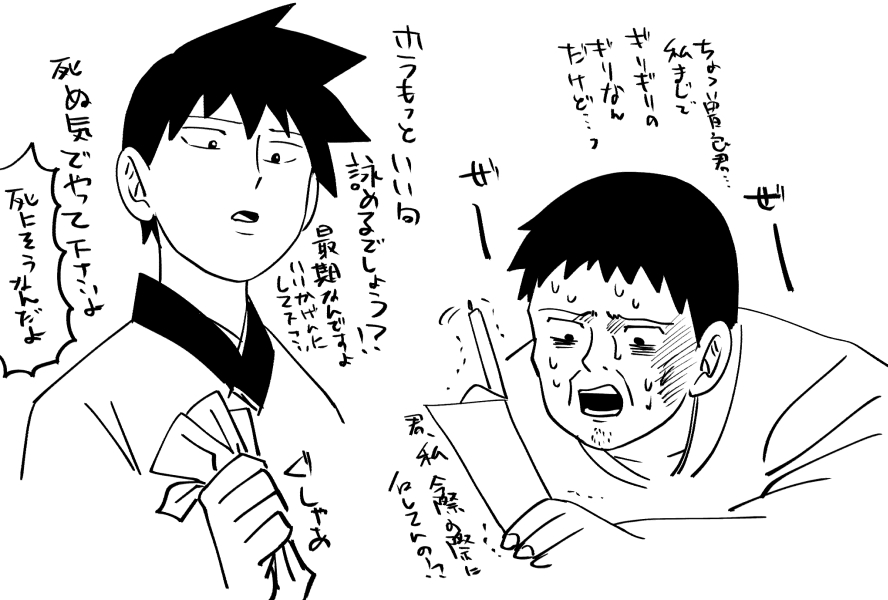 もしも師匠の仇を目の前にしたらモブはどうなるのかとか想像して描いたけどモブは「やるのか?」と問われたら「その権利は僕にはない。あんたを裁くのは法律だ」と冷静に言いそうだなぁと思いました