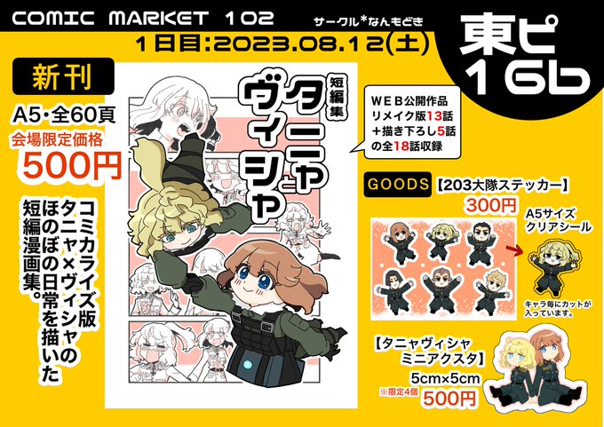 あなたのサークル「なんもどき」は、コミックマーケット102で「土曜日 東地区 “ピ” ブロック 16b」に配置されました! う、受かったーーーーー??!!!!!! コミケもサークル参加自体もド初心者サークルですが、頑張ってタニャヴィシャ本出すのでよろしく下さい!! #C102