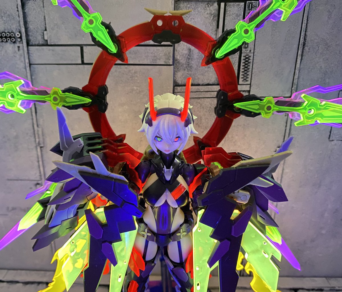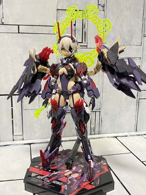 アクリルパーツ盛って大将軍みたいになったスサノヲ。 赤いクリアパーツと目もブラックライトに反応してる。 #メガミデバイス
