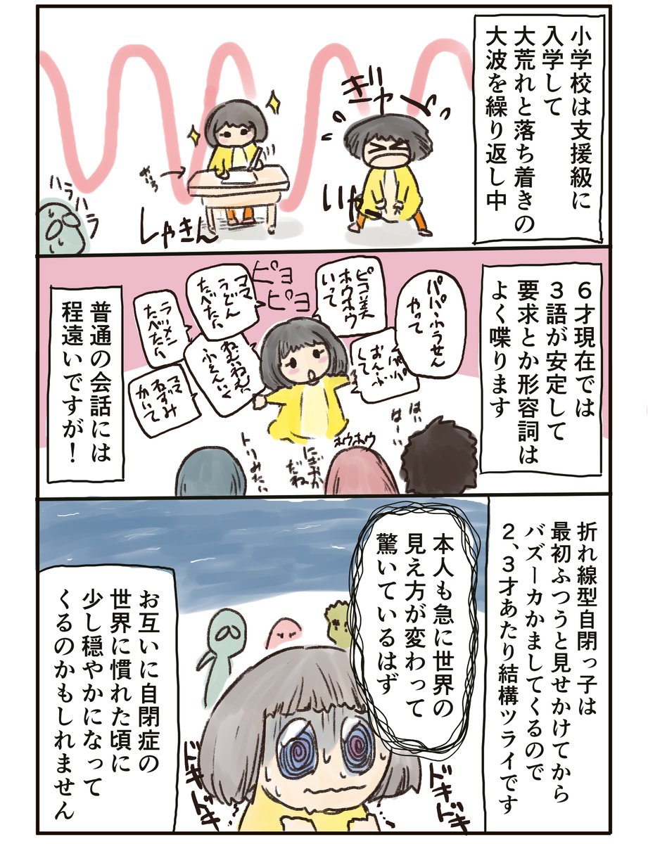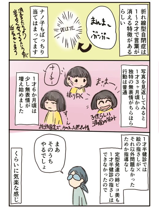 折れ線型自閉っ子、ナノ子の言葉が急に消えた時期とその後の様子について。 あんなに突然自閉症が始まる(変な言い方…)なんて、本人もビックリだと思われます。 nanopicoblog.com/asd-oresen-jik… #育児漫画 #エッセイ漫画 #自閉症スペクトラム