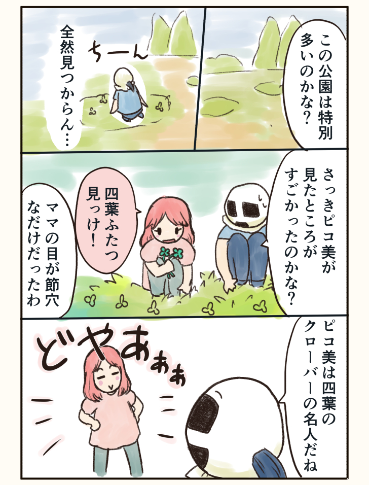 四葉のクローバー名人なお姉ちゃん。 昔探偵ナイトスクープでこういうのみた!って思いました。 nanopicoblog.com/four-leafclove… #子育て漫画 #エッセイ漫画 #漫画が読めるハッシュタグ