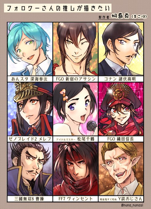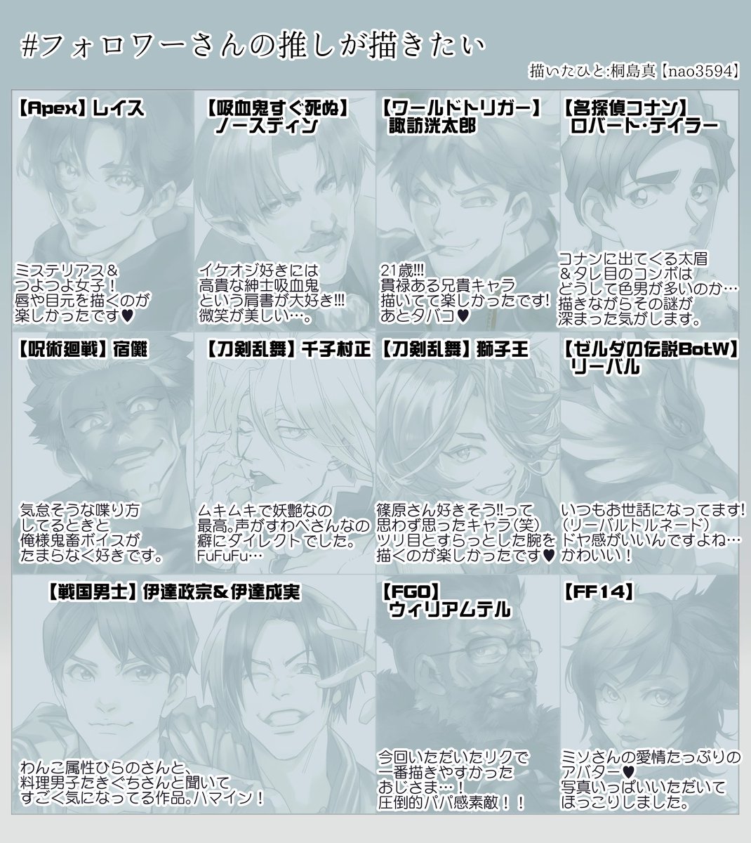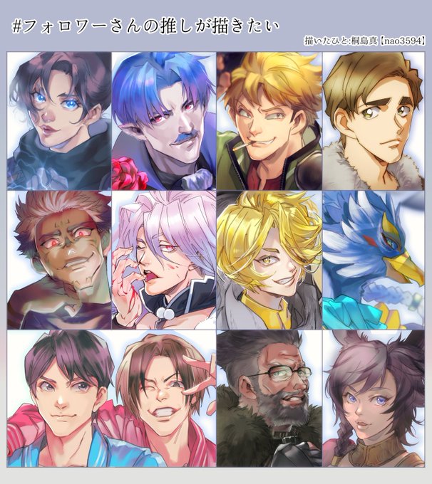 おまたせしました!リクエストいただいたキャラを描かせていただきました♥普段描かないキャラクターでいっぱいで描くのが楽しかったです!ありがとうございました。 #フォロワーさんの推しが描きたい twitter.com/nao3594/stat…
