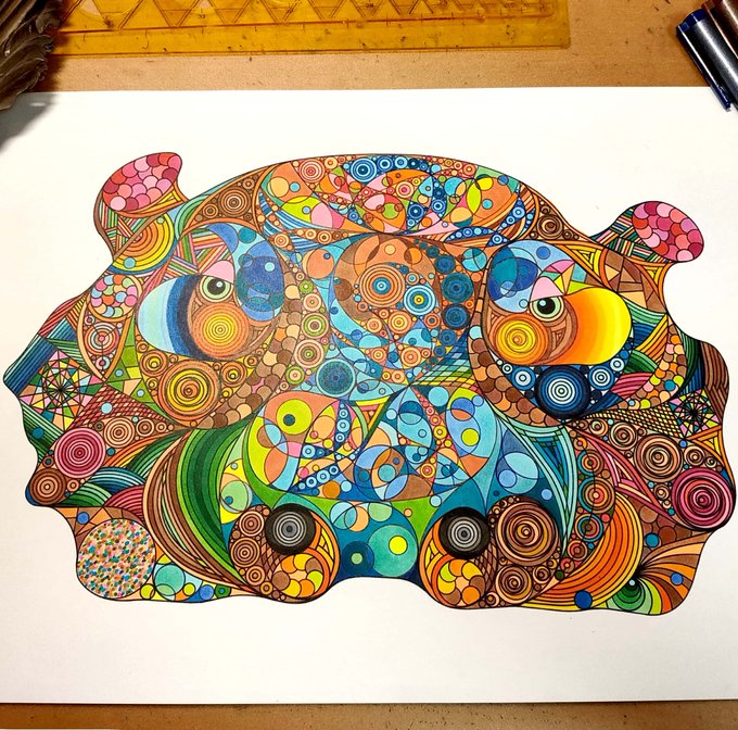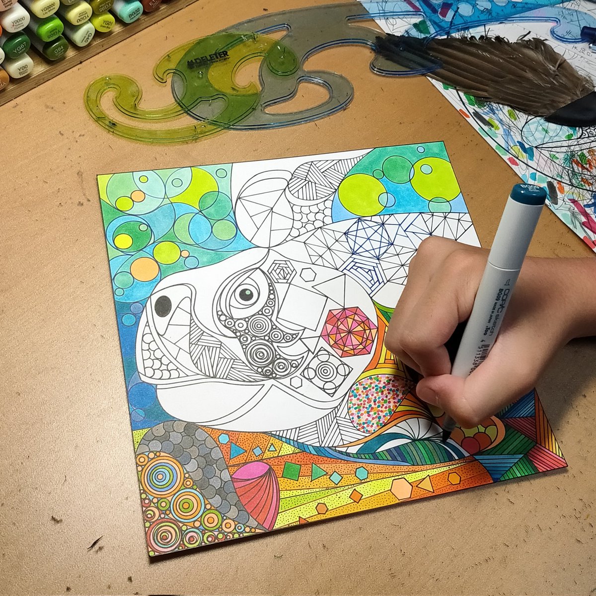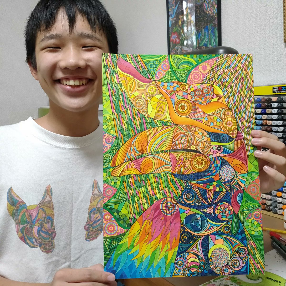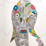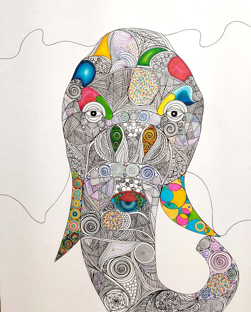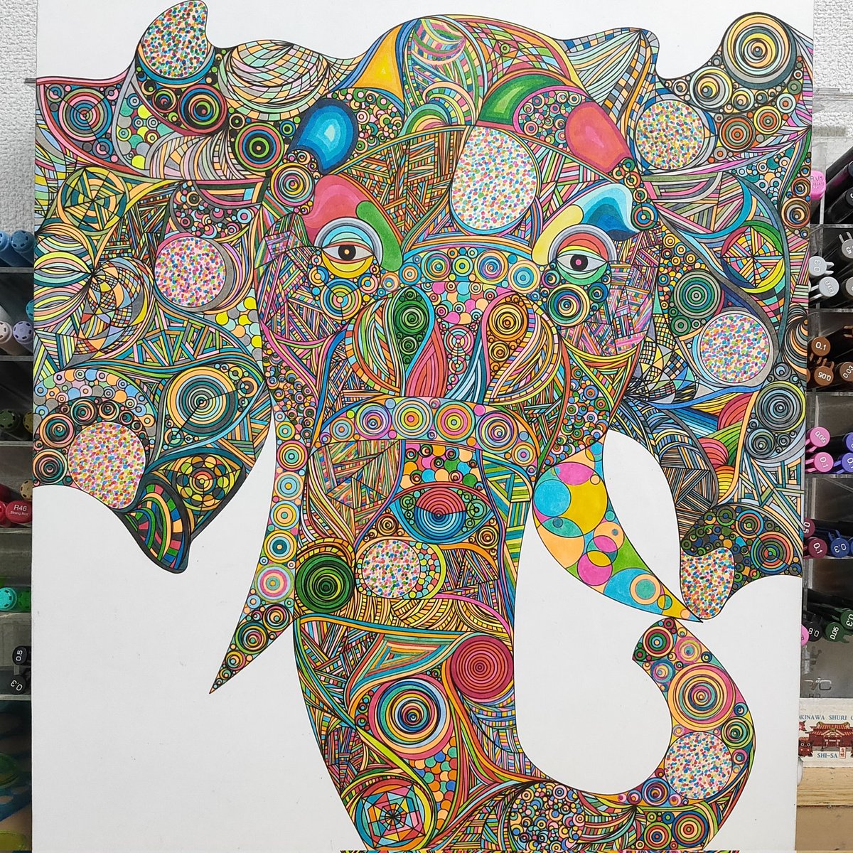 千裕の描く象の絵、顔の部分が完成しました!今までよりもずっと細かくカラフルに仕上げています。もう少しでテスト期間の為テスト勉強中心になりますが、体と背景も頑張って仕上げると意気込んでいました! 完成が楽しみです! #art #illustration #copic