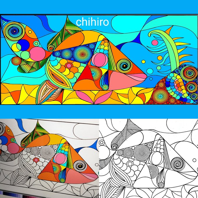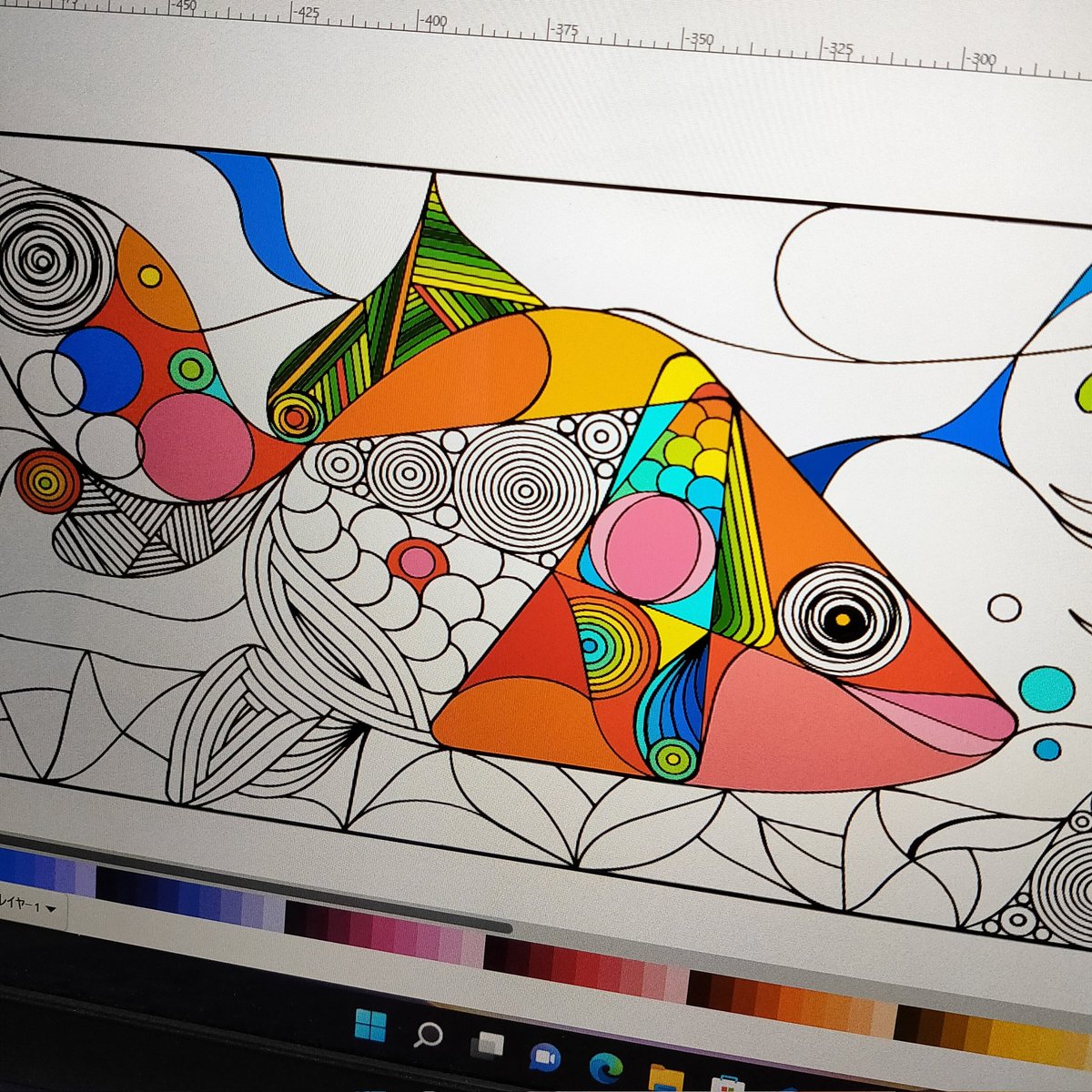 千裕の描く琉金が完成です!涼しげな水の中を、ゆったりと楽しそうに泳ぐ姿をユニークに表現しました。今回は訳あって横長の作品になります、また詳細が決まればお伝えしたいと思います! #art #digitalart