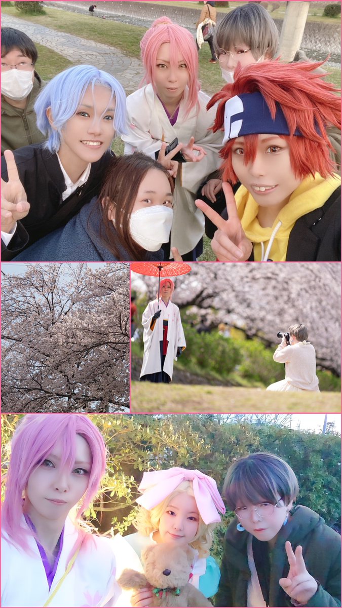 【コスプレ】しょーさんとらぢおさんと桜撮影いってきました🌸🌸素敵なロケーションで朝から夜遅くまで遊んでもらえて最高の一日でした!夏目さんランガ、浅瀬さん暦、椿さんとも無事DAPできたしゆうきさんにも久々にお会いできて良かったー😭💕また遊んでー! photo→しょーさん
