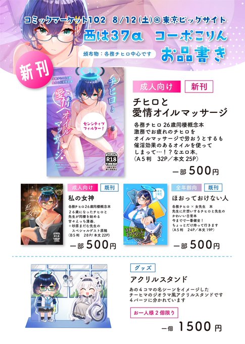 71 131 C102 一日目西は37a コーポこりんのお品書きです! チヒロの頒布物ばっかりです! アクスタもあります! 詳細は画像をよろしくお願いします❣️ #C102お品書き 23/08/09 11:46