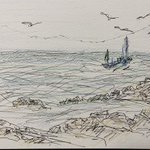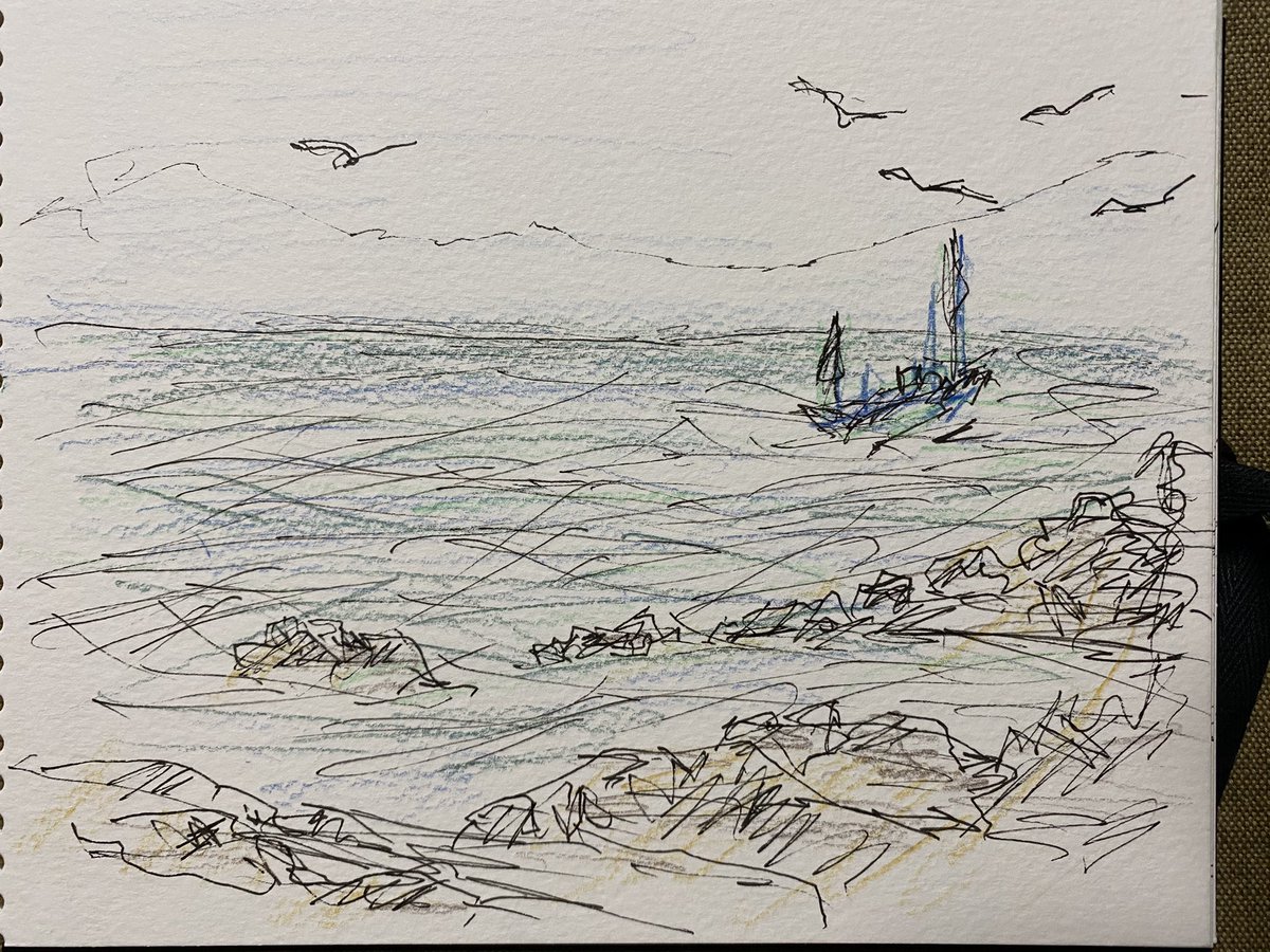 水彩画 昨夜の雨もあがり、今日は曇り空で涼しい。近くの河原にスケッチに行きました。 「丹沢山系大山 と相模川、対岸の環境センター」 #水彩画 #ウォーターフォード水彩紙ブロックF4 #ホルベイン水彩絵具 #アクリルガッシュ #水彩色鉛筆